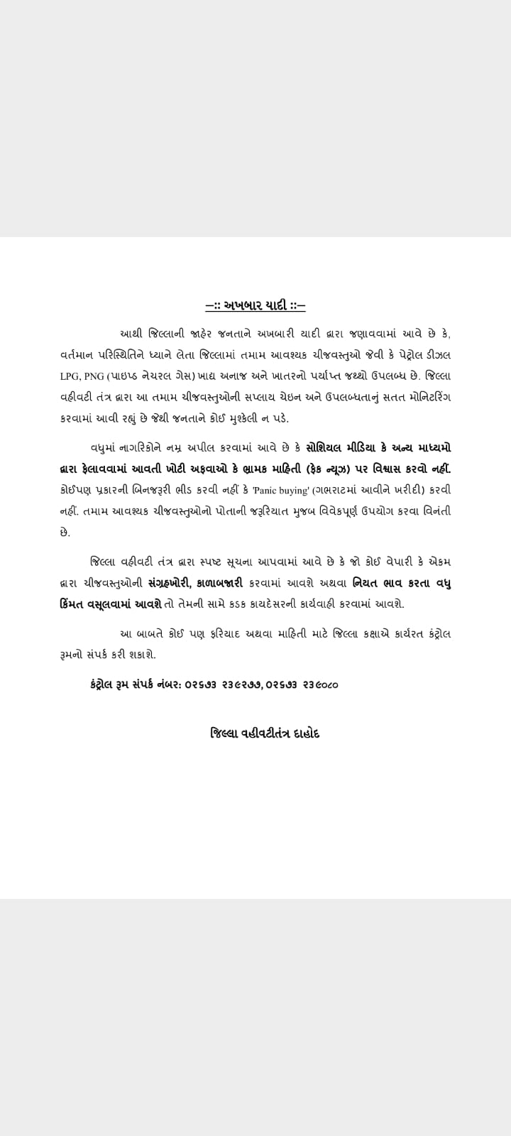 રાજેશ વસાવે :- દાહોદ *દાહોદ જિલ્લામાં તમામ આવશ્યક ચીજવસ્તુઓ જેવી કે પેટ્રોલ ડીઝલ LPG, PNG (પાઇપ્ડ નેચરલ ગેસ) ખાદ્ય અનાજ અને ખાતરનો પર્યાપ્ત જથ્થો ઉપલબ્ધ* દાહોદ તા. ૨૮ દાહોદ જિલ્લાની જાહેર જનતાને અખબારી યાદી દ્વારા જણાવવામાં આવે છે કે, વર્તમાન પરિસ્થિતિને ધ્યાને લેતા જિલ્લામાં તમામ આવશ્યક ચીજવસ્તુઓ જેવી કે પેટ્રોલ ડીઝલ LPG, PNG (પાઇપ્ડ નેચરલ ગેસ) ખાદ્ય અનાજ અને ખાતરનો…
