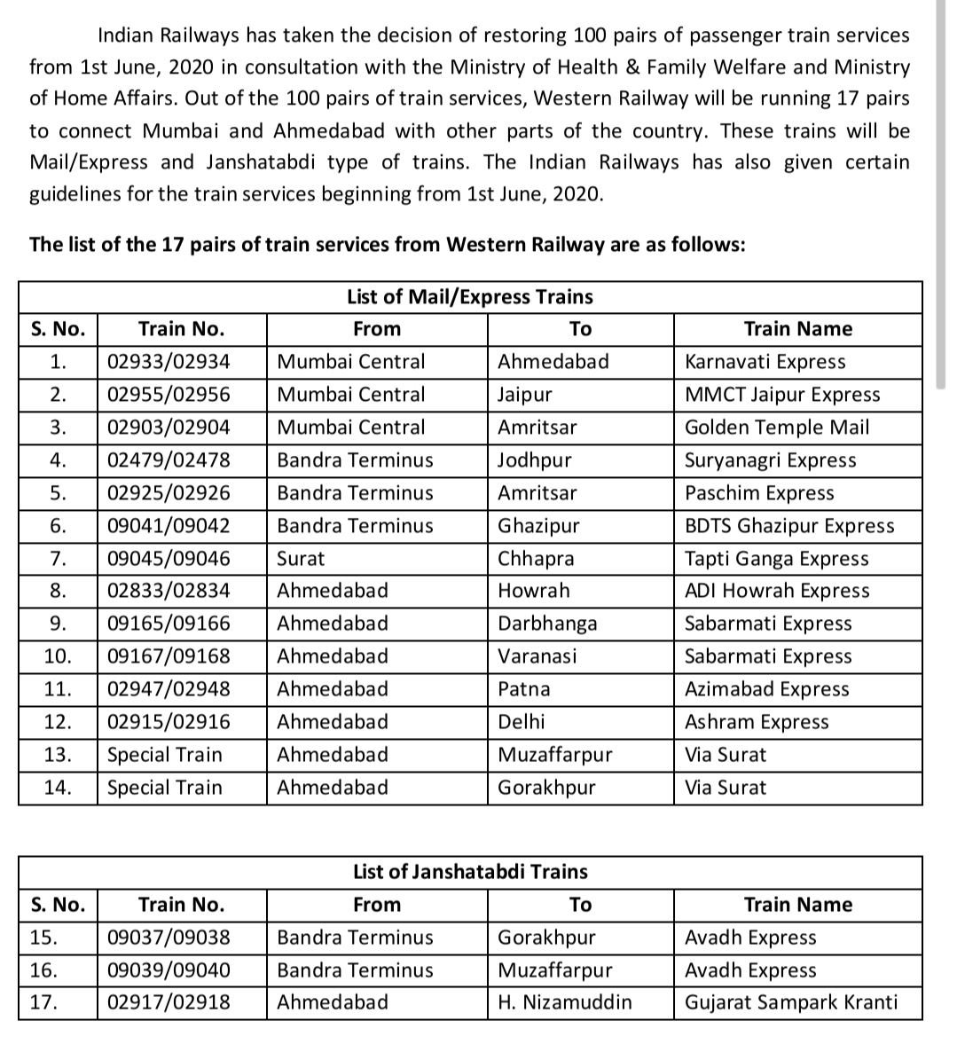 મહામારી કોરોના અને લોકડાઉનને કારણે અત્યાર સુધી ભારતીય રેલના પૈડા થંભી ગયા હતા .પરંતુ રેલ મંત્રાલય હવે ટ્રેન સેવાને તબક્કાવાર શરૂ કરવામાં આવી રહી છે . હવે શ્રમિક અને એસી ટ્રેનોની સાથે સાથે 1 જૂનથી નોન એસી 200 ટ્રેન ચલાવવાનો નિર્ણય કર્યો છે . જેનું ઓનલાઈન બુકિંગ પણ શરૂ થઈ ગયું છે . આ ટ્રેનોનું આજે સવારના 10 વાગ્યાથી બુકિંગ પણ શરૂ થઈ ગયું છે.જેમાં મહત્તમ 30 દિવસનું એડવાન્સ બુકિંગ થઈ શકશે અને ઓનલાઈન જ બુકિંગ થઈ શકશે . માત્ર એટલું જ નહીં જેટલી સીટ હશે એટલી જ ટીકિટ ઈસ્યુ કરવામાં આવશે . હવે 200 ટ્રેનની યાદી સાથે તેનાં નીતિ નિયમો પણ જાહેર કરવામાં આવ્યા છે . 200 માંથી 10 ટ્રેન ગુજરાતને ફાળવવામાં આવી જેમાંની મોટાભાગની ટ્રેનો અમદાવાદની છે. ત્યારે મુસાફરોને યાત્રા દરમિયાન સાવચેતીના ભાગરૂપે માસ્ક પહેરવું શોશ્યલ ડિસ્ટન્સ સહિતની કાળજી લેવી પડશે.