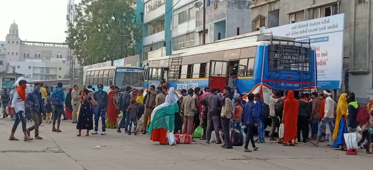 કોરોના જેવી વૈશ્વિક મહામારીમાં મધ્ય પ્રદેશ તેમજ ગુજરાતની બસોમાં ઘેટા બકરાંની જેમ ઠુંસી ઠુંસી તેમજ શોશ્યલ ડિસ્ટન્સ સહિતના નિયમો નેવે મૂકી બેરોકટોક અવરજવર કરતા મુસાફરો:બસ સ્ટેશનમાં સ્ક્રીનિંગનો અભાવ, કોરોના સંક્રમણ ફેલાવવાની સેવાતી ભીતિ