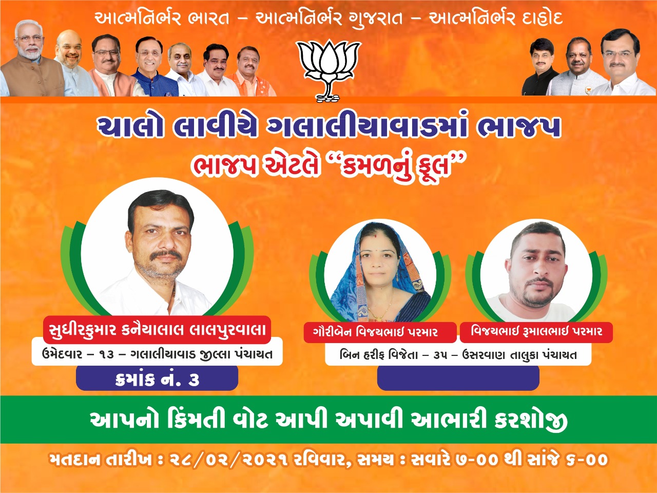 સ્થાનિક સ્વરાજની તાલુકા પંચાયતો, જિલ્લા પંચાયતો તેમજ નગરપાલિકાની ચૂંટણીઓને લઇ રાજકીય પક્ષો હાલ જોરશોરથી પ્રચાર કરી મતદારોને રિઝવવાનો પ્રયાસ કરી રહ્યા છે. ત્યારે બીજેપીના પૂર્વ જિલ્લા પ્રમુખ તેમજ 13 ગલાલીયાવાડ જિલ્લા પંચાયત બેઠકના ઉમેદવાર સુધીરભાઈ લાલપુરવાળાએ દાહોદ લાઈવ ન્યુઝ નેટવર્ક મારફતે દાહોદ જિલ્લાની તમામ જિલ્લા પંચાયતો તેમજ તાલુકા પંચાયતોમાં સૌનો સાથ સૌનો વિકાસના નારા સાથે ભાજપ તરફી ભારે મતદાન કરી વિજય બનાવી આપ સૌ મતદારોને અપીલ કરી છે.