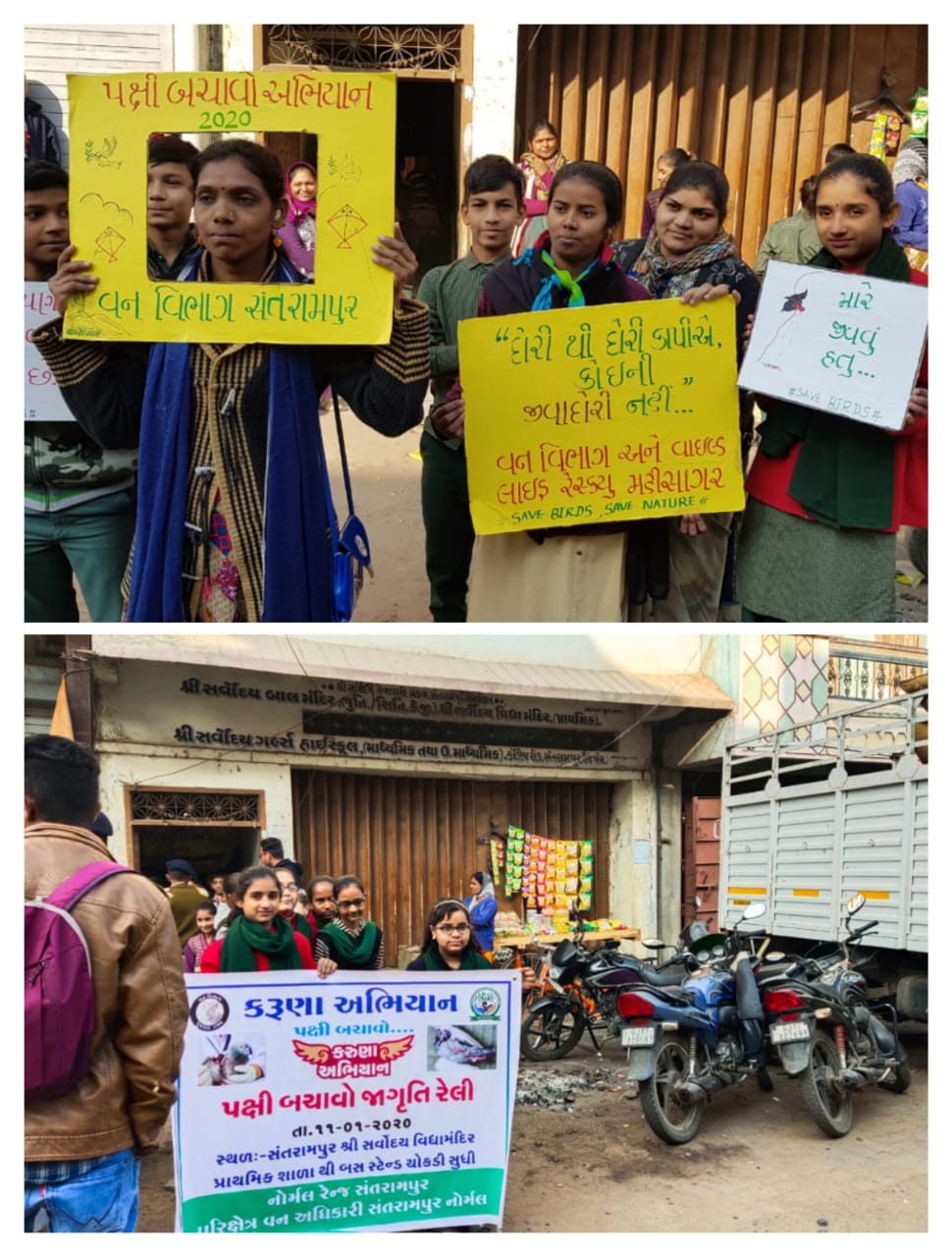 સંતરામપુરનગરમાં કરુણા અભિયાન અંતર્ગત પક્ષી બચાવો અભિયાન સાથે રેલી યોજાઇ હતી. આજરોજ સંતરામપુર નગરમાં સ્કૂલના વિદ્યાર્થીઓ સાથે વન વિભાગના અધિકારી કર્મચારી તથા પ્રકૃતિ મંડળ ના સહયોગથી સંતરામપુર નગરમાં પક્ષી બચાવો કરુણા અભિયાન રેલી યોજવામાં આવી હતી ઉતરાણના દિવસે આકાશમાં પતંગોના આકાશી યુધ્ધ જામે છે પરંતુ અબોલ પક્ષીઓ સવારના સાંજના આકાશમાં ઉડતા હોય છે મોટાભાગે પક્ષીઓ દોરી વાગવાથી ઘાયલ અને ઇજાગ્રસ્ત બનતા હોય છે જેના ભાગરૂપે સંતરામપુર વનવિભાગ દ્વારા પક્ષીઓને ઘાતક દોરાથી બચાવવાં અભિયાન અંતગર્ત લોકજાગૃતિ માટે રેલી યોજાઇ હતી જેમાં ઉતરાયણના દિવસે પતંગ ઉડાડવા બાબતે અને દોરી બાબતે વનવિભાગ દ્વારા સમજ અપાઇ હતી સંતરામપુર નગરમાં રેલી કાઢી હાઈસ્કુલ ના વિદ્યાર્થીઓ સૂત્રોચાર કરી નગરજનોમાં પક્ષી બચાવો માટે જાગૃત કર્યા હતા સાથે જ વહેલી સવારે પક્ષીઓ આકાશમાં ઉડતા હોય અને મોડી સાંજે ઉડતા હોય પહેલા પક્ષી પરત આવતા હોય પતંગ ચગાવવાથી સમજ અપાઇ હતી ઉતરાયણ તહેવાર ઉત્સવનું હોય સાંજના સમયે ફટાકડા ફોડતા હોય ના ફોડવાની સૂચનાને સમજ અપાઇ હતી એકંદરે સંતરામપુર નગરમાં રેલી યોજીને ઘાયલ પક્ષીઓને રેકયુ સેન્ટર સુધી અને કોઠાના બોક્સમાં જે તે સેન્ટર પર પક્ષી લઈને જવાની સમજ આપો અને સંતરામપુર વિદ્યાર્થીઓને પતંગ ચગાવવાના શપથ લેવડાવ્યા હતા.આ અભિયાનમાં વહીવટી તંત્ર અને મહીસાગર જિલ્લા કલેકટરે સુચના આપી હતી.