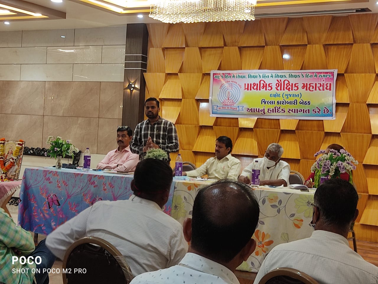 આજ રોજ પ્રાથમિક શૈક્ષિક મહાસંઘ દાહોદ જિલ્લા ની કારોબારી બેઠક જિલ્લા અધ્યક્ષશ્રી બળવંતસિંહ ડાંગરની અધ્યક્ષતામાં ઘનશ્યામ હોટલ પીપલોદ મુકામે યોજાય હતી.જિલ્લા કારોબારી બેઠક માં સદસ્યતા અભિયાનની કામગીરી ની સમીક્ષા,ગુરુ વંદના કાર્યક્રમ નાં આયોજન વિશે,શિક્ષકો નાં પડતર પ્રશ્નો સંદર્ભે,HTAT નાં પ્રશ્નો, તાલુકાની વહીવટી બાબતો સંદર્ભે વિસ્તૃત ચર્ચા કરવામાં આવી હતી.આજની બેઠક માં જિલ્લાના દરેક તાલુકામાં નવીન વાલીની નિયુક્તિ કરીને તેમની જવાબદારી થી તેમને વાકેફ કરવામાં આવ્યાં.આજની આ જિલ્લા કારોબારી બેઠક માં દાહોદ જિલ્લા પ્રાથમિક શિક્ષણાધિકારી સાહેબ મયુરભાઈ પારેખ સાહેબ દ્વારા ‘મિશન નેચર કેર’ અંતર્ગત જિલ્લાની દરેક શાળામાં શિક્ષકદીઠ 10 રોપાના વૃક્ષારોપણ કાર્યને હાંકલના સ્વરૂપમાં ઉપાડી લેવા માટે જિલ્લા અધ્યક્ષે આહ્વાન કર્યું હતું.બેઠક માં ઝાલોદ તાલુકા માટે નવીન મંત્રી દેવાંગભાઈ વસૈયા તથા સંગઠન મંત્રી તરીકે વાલસિંગભાઈ મકવાણા ની નિયુક્તિ કરવામાં આવી હતી.