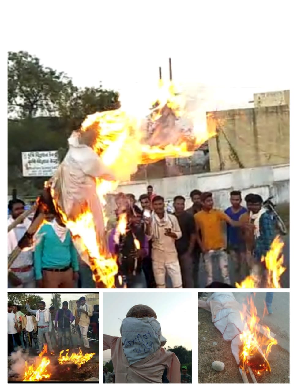 - રાજ્ય સરકાર દ્વારા ચારણ, ભરવાડ, અને રબારી સમાજને આદિજાતીના પ્રમાણ પત્રો સંદર્ભે રાજ્યભરના આદિવાસી સમાજમાં વિરોધ વંટોળ ઉભો થયો છે.ત્યારે આદિવાસી સમાજ દ્વારા ગાંધીનગર ખાતે આદિજાતિના પ્રમાણપત્રો રદ્દ કરવાની માગ સાથે છેલ્લા કેટલાય દિવસથી ધરણા પર બૈઠા છે.ત્યારે આજ રોજ દાહોદના આદિવાસી બચાવ સમિતિ દ્વારા મુવાલિયા ક્રોસિંગ ખાતે ભેગા થઇ નાયબ મુખ્યમંત્રી નીતિન પટેલ વિરુદ્ધ સુત્રોચાર કરી પૂતળું દહન કરતા ચકચાર મચી જવા પામી છે. સમગ્ર રાજ્યમાં ચારણ ભરવાડ અને રબારી સમાજને અપાયેલ આદિવાસીના પ્રમાણ પત્ર અંગે ઉઠેલા વિરોધ વંટોળમાં દાહોદના મૌર્ય વિસ્તારના લોકો પણ આજે જોતરાયા હતા મોડી સાંજે સાચા આદિવાસી અને આદિવાસી અધિકાર બચાવ સમિતિના નેજા હેઠળ દાહોદના મુવાલિયા ક્રોસિંગ ખાતે કેટલાક કાર્યકરોએ રાજ્યના નાયબ મુખ્યમંત્રી નીતીનભાઇ પટેલના પૂતળાનું દહન કરી સૂત્રોચ્ચાર કર્યો હતો છેલ્લા એક મહિનાથી આ સરકારની સામે આંદોલન કરવા છતાં પરિણામ શૂન્ય મળતા અમે આ વિરોધ ઘર-ઘર સુધી પહોંચાડીશું તેઓ હું કાર પણ કર્યો હતો તો નીતિન પટેલ વિરુદ્ધ સૂત્રોચ્ચાર પણ કર્યો હતો અને ન્યાય ન મળે ત્યાં સુધી ધરણા ચાલુ રાખવાનો પણ જણાવ્યું હતું.