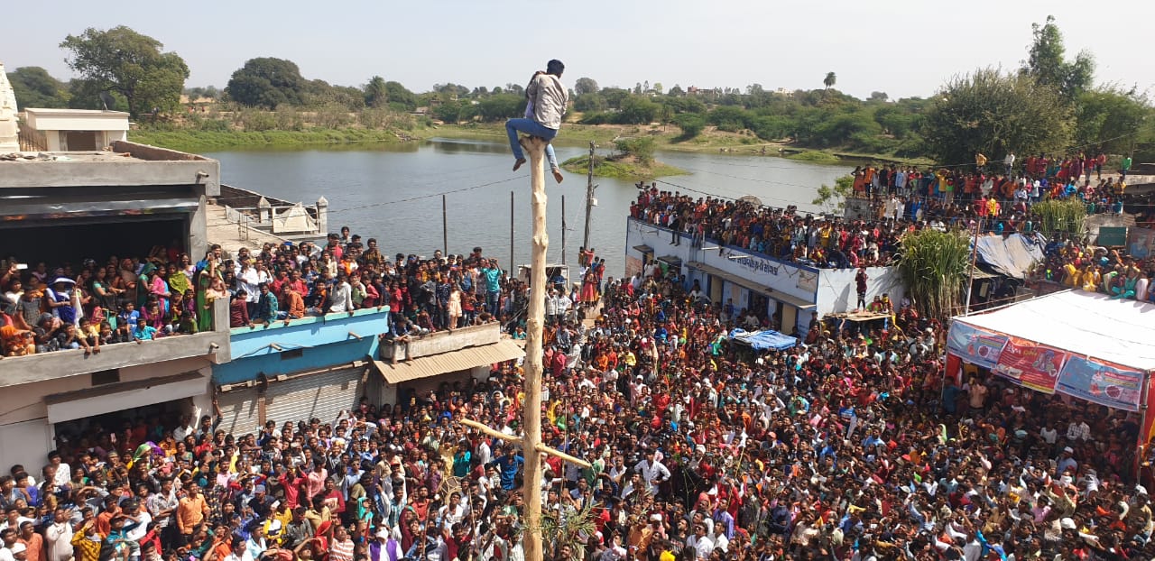 જેસાવાડા ગામમાં પંચાયત ઓફિસ પાસેના ચોકમાં ૩૦ ફુટ જેટલો ઊંચો સીમળાનો લીસ્સો થાંભલો રોપવામાં આવ્યો હતો અને તેની ટોચ પર ગોળ ભરેલી પોટલી બાંધવામાં આવી હતી. આજુબાજું ગામોના નવયુવાનો પોતાની બહાદુરી બતાવવા છોકરીઓની સોટીઓનો માર ખાતા જઈને પણ લીસ્સા થાંભલા પર બીજાને પાડીને પોતે થાંભલા ઉપર ચઢી ગોળની પોટલી ઉતારવાની કોશિશ કરતાં હતા અને તેમાં જેસાવાડા કટારા સમાજના રાજેશ કટારા નામનો યુવક થાંભલા પર પ્રથમ ચઢીને ગોળની પોટલી ઉતારતા તે વિજેતા બન્યો હતો.