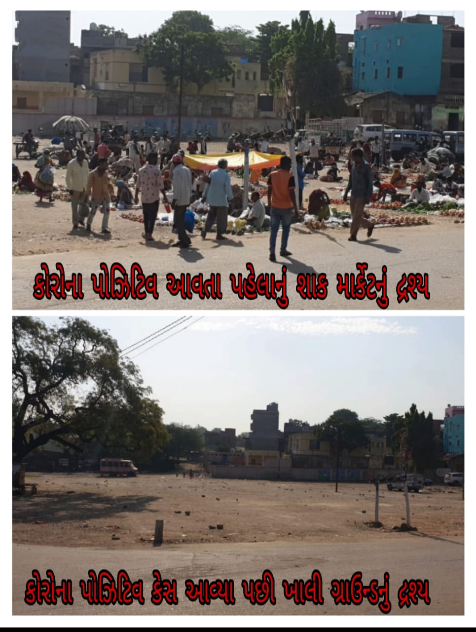 ફોટો કેપ્શન પ્રસ્તુત પ્રથમ તસ્વીરમાં કોરોના પોઝીટીવ રીપોર્ટ આવતા પહેલાંનું ગરબાડા નું હંગામી શાકમાર્કેટ જ્યારે બીજી તસવીરમાં કોરોના પોઝીટીવ રીપોર્ટ આવ્યા બાદ નું સુમસામ ભાસી રહેલું શાકમાર્કેટ દ્રશ્યમાન થાય છે