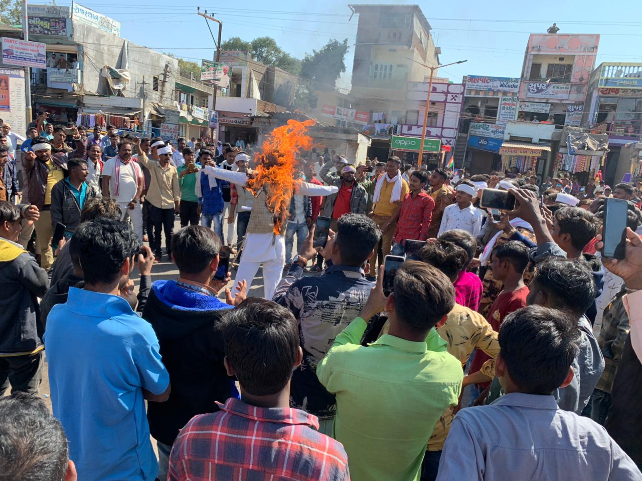 લીમખેડામાં આજે બપોરે ભીલીસ્તાન ટાઈગર સેનાના કાર્યકરો દ્વારા રેલી નીકળી હતી. દાહોદ ભાજપના સાસંદ જશવંતસિંહ ભાભોર તથા લીમખેડાના ધારાસભ્ય શૈલેષભાઈ ભાભોર આદિવાસીઓના અન્યાયમાં સમર્થન આપી રહ્યા હોવાનું જણાવી તેઓ વિરૂધ્ધ સુત્રોચ્ચાર પોકાર્યા હતા. બપોરના ૧.૩૦ કલાકના સુમારે લીમખેડા બજારમાં શાસ્ત્રીચોક પહોંચી દાહોદ ભાજપના સાંસદ જશવંતસિંહ ભાભોરના પુતળાનું દહન કરવામાં આવ્યું હતુ. ૧પ થી ર૦ મિનીટ સુધી લીમખેડા બજારમાં શાસ્ત્રી ચોક ખાતે પુતળા દહન કરી ચક્કાજામ કર્યા હતા. સોરાષ્ટ્ર વિસ્તારમાં માલધારી સમાજના ભરવાડ, રબારી અને ચારણ જાતિઓને આદિવાસીઓમાં સમાવી પ્રમાણપત્રો આપવામાં આવતા તેનો ભીલીસ્તાન ટાઈગર સેના દ્વારા વિરોધ નોંધાવ્યો હતો.