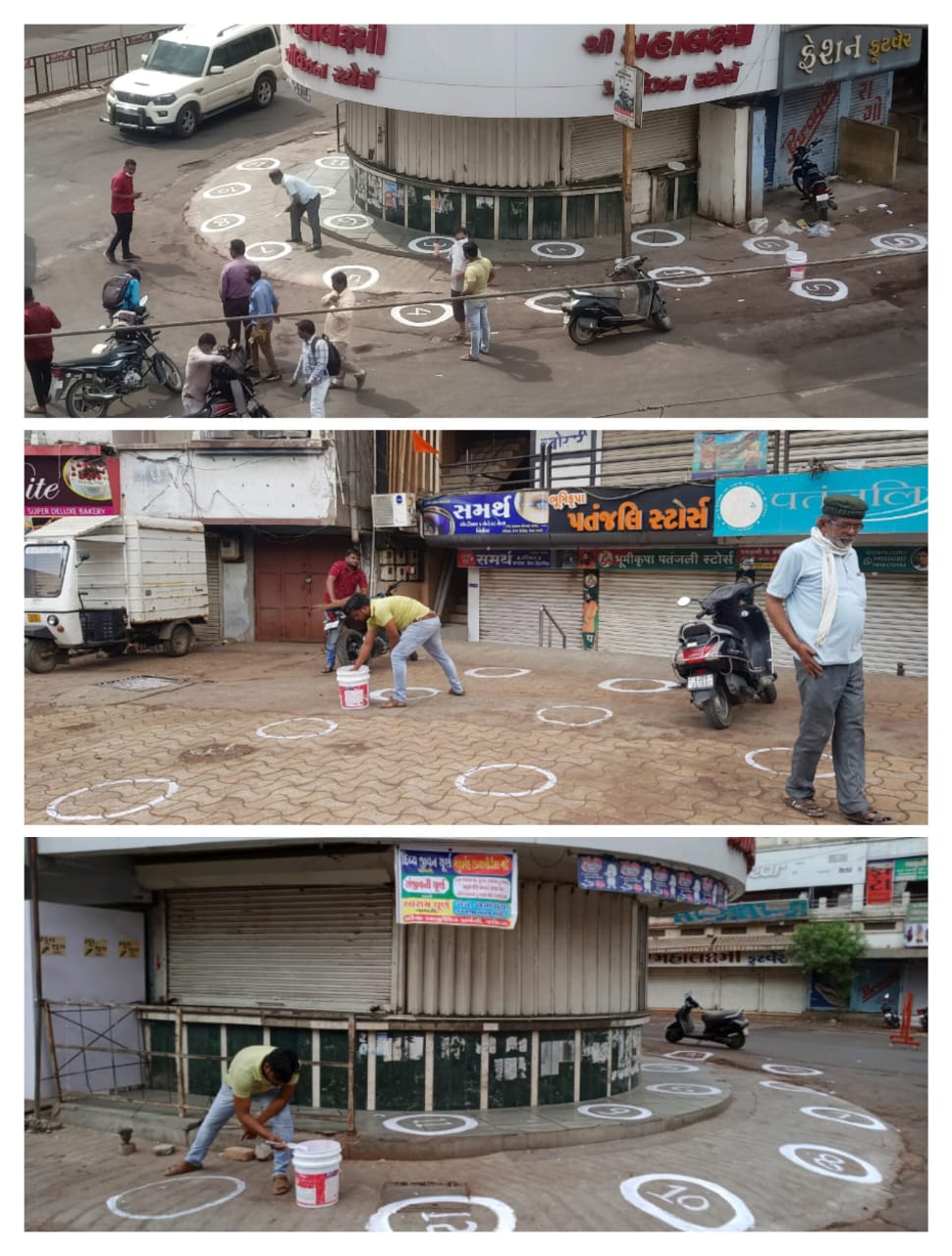 કોરોના વાયરસના સંક્રમણને રોકવા વહીવટીતંત્રના સૂચન પર વ્યાપારીની અનોખી પહેલ: ગ્રાહકો વચ્ચે અંતર રાખવા ગોળ કુંડાળા કર્યા