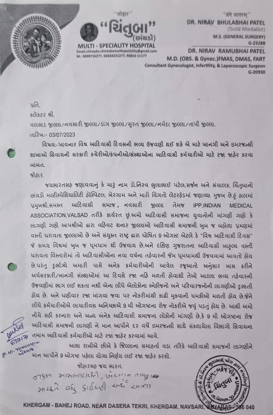 સમસ્ત આદિવાસી સમાજ,નવસારી જિલ્લા પ્રમુખ દ્વારા દરવર્ષે 9મી ઓગસ્ટના દિવસે ઇમરજન્સી શાખાઓ સિવાયના તમામ સરકારી/અર્ધ સરકારી/ખાનગી આદિવાસી કર્મચારીઓ માટે રજા જાહેર કરવા માંગ.*