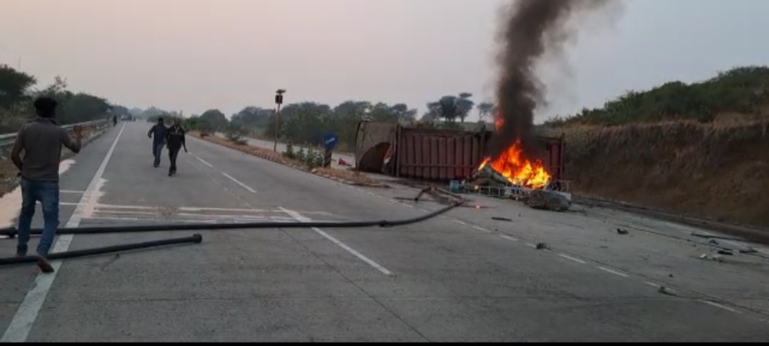 દાહોદ તાલુકાના જેકોટ નજીક ઇન્દોર અમદાવાદ નેશનલ હાઈવે ઉપર હાઇડ્રોજન ઓક્સિજન ગેસના ખાલી ટેન્કર ભરેલા કન્ટેનર તેમજ ટ્રક વચ્ચે અકસ્માત સર્જાતા ઓક્સિજનના ખાલી સ્લીન્ડર ભરેલા કન્ટેનરમાં આગ લાગતા દોડધામ મચી હતી.જેમાં ટ્રક ચાલક આગની લપટોમાં ભડથું થઈ જવા પામ્યો હતો. જોકે સાંજના સમયે બનેલી આ ઘટનાના પગલે દાહોદ ગોધરા વચ્ચેનો બન્ને તરફનો વાહન વ્યવહાર ઠપ્પ થઈ જવા પામ્યો હતો. ઘટનાની જાણ દાહોદ ગ્રામ્ય પોલીસને થતા asp જગદીશ બાંગરવા તેમજ CID ક્રાઇમના પોલીસ અધિકારી સહીત ગ્રામ્ય પોલીસના પીએસઆઇ તેમજ પોલીસ કર્મચારીઓ ઘટના સ્થળે દોડી આવ્યા હતા..