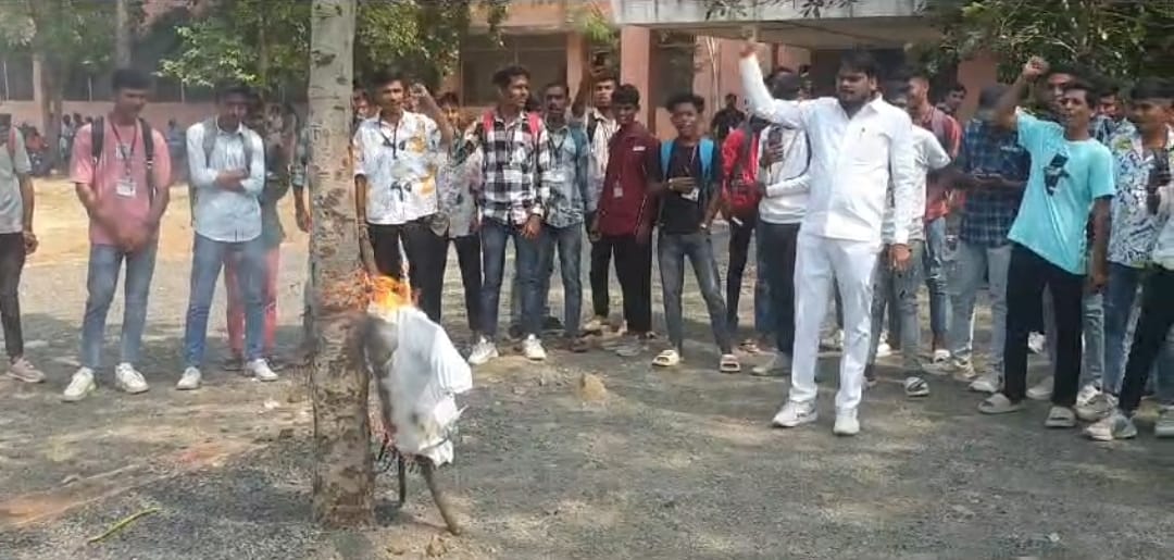 દાહોદની નવજીવન કોલેજ બહાર યુદ્ધ કોંગ્રેસ દ્વારા શિક્ષણ મંત્રી કુબેર ડીંડોરના પૂતળાનું દહન,કોલેજના ગેટને તાળાબંધીની ચીમકી…
