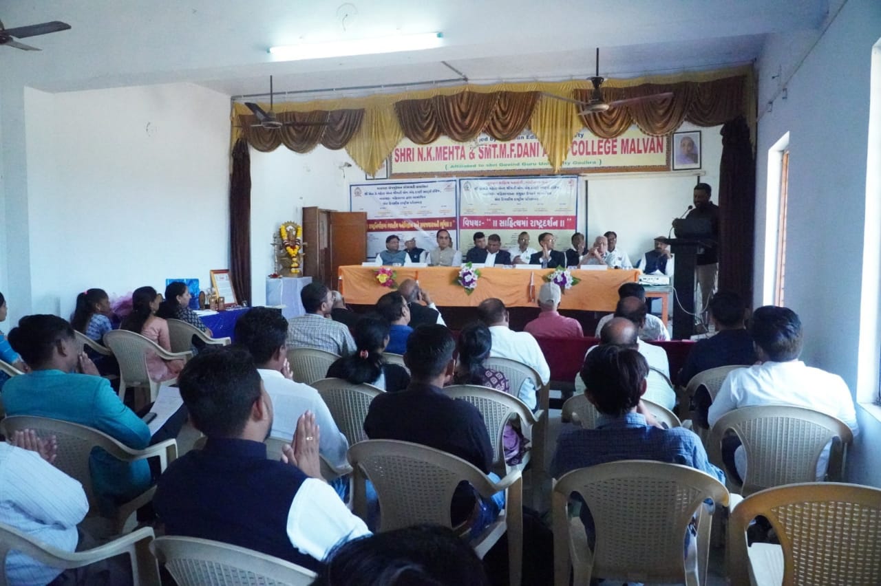 ગુજરાત સાહિત્ય અકાદમી, ગાંધીનગર અને શ્રી એન.કે.મહેતા અને શ્રીમતી એમ.એફ.દાણી આર્ટ્સ કૉલેજ માલવણના સંયુક્ત ઉપક્રમે એક દિવસીય રાષ્ટ્રીય પરિસંવાદ સાહિત્યમાં રાષ્ટ્રદર્શન વિષય ઉપર યોજવામાં આવ્યો હતો.એમ પરિસંવાદ કાર્યક્રમમાં પધારેલ મહેમાનોને આવકાર સંસ્થાના આચાર્ય પ્રિન્સિપાલ ડૉ.સી.એમ પટેલે આપ્યો હતો.કાર્યક્રમના અધ્યક્ષ તરીકે માનનીય ડૉ.કુબેરભાઈ ડીંડોર,કેબીનેટ મંત્રીશ્રી આદિજાતિ વિકાસ,પ્રાથમિક, માધ્યમિક અને પ્રોઢ શિક્ષણ, ગુજરાત સરકાર,મુખ્ય અતિથિ તરીકે શ્રી ગોવિંદ ગુરુ યુનિવર્સિટીના કુલપતિ પ્રો.ડૉ. પ્રતાપસિંહ ચૌહાણે વર્ચ્યુઅલ માધ્યમથી જોડાઈને શુભેચ્છા સંદેશ પાઠવ્યો હતો.ઉદ્ધાટક પ્રા.એન.આર. પાટીદાર માલવણ એજ્યુકેશન સોસાયટી ઉપસ્થિત રહ્યા હતા. બીજરૂપ વક્તવ્ય પ્રો.ડૉ.બી.કે. કલાસવા સૌરાષ્ટ્ર યુનિવર્સિટી રાજકોટ એ આપ્યું હતું.પ્રથમ બેઠકના વક્તા તરીકે મહર્ષિ યાદવેન્દ્રજી જીવોત્થાન સંસ્થા,ઉદેપુર, રાજસ્થાન હતા.દ્વિતીય વક્તા તરીકે ડૉ.મહેશ એ. પટેલ અધ્યક્ષ,સંસ્કૃત વિભાગ,ગુજરાત આર્ટ્સ એન્ડ સાયન્સ કૉલેજ અમદાવાદ હતા.અન્ય વક્તા તરીકે ડૉ.વિનોદ ગાંધી,ડૉ.દિનેશ માછી ઉપસ્થિત રહ્યા હતા.દ્વિતીય બેઠકના અધ્યક્ષ તરીકે પ્રોફેસર રાજેશ વ્યાસ ઉપસ્થિત રહ્યા હતા.શોધપત્ર વાંચન સત્રના અધ્યક્ષ તરીકે ડૉ.જગદીશ માછી હતા.સંચાલન ડૉ. વિમલ ગઢવીએ કર્યું હતું.વર્ષ ૨૦૧૯ થી ૨૦૨૩માં કોલેજ પ્રથમ આવનાર વિદ્યાર્થોઓને સિલ્વર મેડલ આપી સન્માનિત કરવામાં આવ્યા હતાં. કોલેજના વિદ્યાર્થીઓ જેમણે જી.પી.એસ.સી પાસ કરી નોકરી મેળવી,એન.એસ.એસ માં આગળ વધ્યા,સ્પોર્ટ્સમાં આગળ વધ્યા તેમનું પણ સન્માન કરવામાં આવ્યું હતુ.આ સમગ્ર પરિસંવાદનું સુચારુ આયોજન તથા સંચાલન કૉલેજ સ્ટાફ દ્વારા કરવામાં આવ્યું હતું.