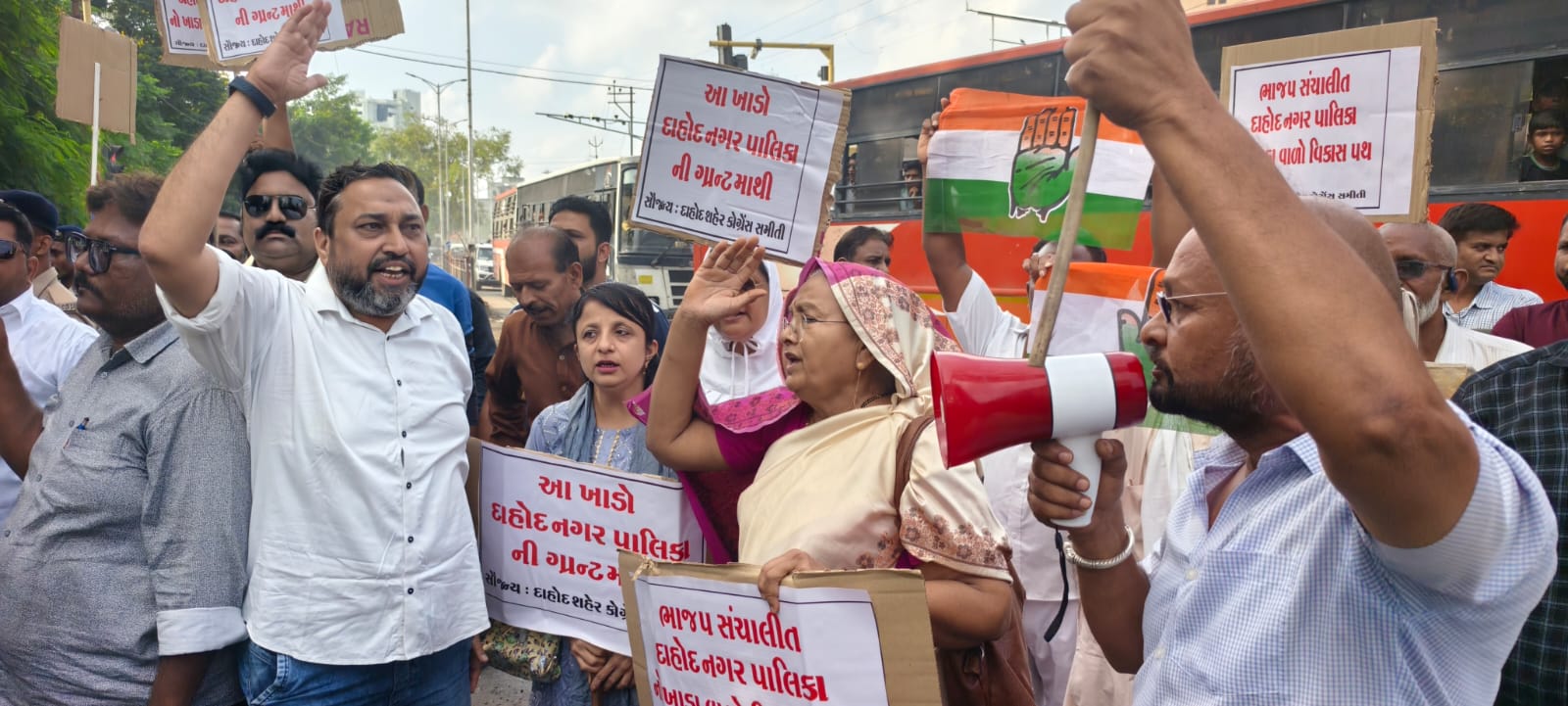 સ્માર્ટ સિટી દાહોદમાં ઠેર ઠેર રસ્તાઓમાં પડેલા ખાડાઓને લઇ આગામી ગણેશ ચતુર્થી અને ઈદે મિલાદ સંદર્ભે દાહોદ વાસીઓને પટ્ટી હાલાકી ને ધ્યાને લઈ દાહોદ શહેર કોંગ્રેસ સમિતિ દ્વારા બિરસા મુંડા ચોક બેનરો સાથે ભાજપ તેમજ નગરપાલિકા વિરોધી સૂત્રોચાર કર્યા હતા.જેના પગલે ટ્રાફિક જામના દ્રશ્યો સર્જાયા હતા.જોકે પોલીસે ઉપરોક્ત કોંગ્રેસના લોકોને અટકાવી વાહન વ્યવહાર ખુલ્લો કર્યો હતો. અત્રે ઉલ્લેખનીય છે કે દાહોદ શહેર કોંગ્રેસ સમિતિએ દાહોદ શહેરના વિવિધ રસ્તાઓ પર પડેલ ખાડાઓને લઈ સ્માર્ટ સિટી પ્રોજેક્ટમાં કરોડો રૂપિયાના ભ્રષ્ટાચાર થયા હોવાના આક્ષેપો કર્યા હતા. સાથે સાથે નગરપાલિકાની કામગીરી સામે પણ વિરોધ કર્યો હતો. આજરોજ બિરસા મુંડા સર્કલ ખાતે યોજાયેલા વિરોધ પ્રદર્શનમાં માજી સાંસદ ડો.પ્રભાબેન તાવીયાડ,શહેર પ્રમુખ આશિફ સૈયદ તેમજ દાહોદ શહેર કોંગ્રેસ સમિતિના પદાઅધિકારીઓ તેમજ કાર્યકર્તાઓએ ભેગા મળી હાય રે ભાજપ હાય હાય, હાય રે મોદી હાય હાયના નારા લગાવ્યા હતા સાથે સાથે નગરપાલિકા વિરુદ્ધ પણ સૂત્રોચાર કર્યા હતા.