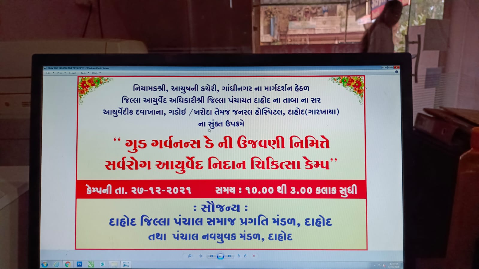 તથા જિલ્લા આર્યુવેદ અધિકારીશ્રી દાહોદ ના તાબા હેઠળના સરકારી આર્યુવેદ દવાખાનું ગડોઈ સરકારી આર્યુવેદ દવાખાનું ખરોદા સરકારી આર્યુવેદ દવાખાનું ગારખાયા દ્વારા ગુડ ગવર્ન્સ ડે ની ઉજવણી નિમિતે સર્વરોગ નિદાન અને ચિકિત્સા કેમ્પનું આયોજન તારીખ 27.12.2021 ને સોમવારના રોજ પંચાલ સમાજની વાડી ચેતના સોસાયટી દાહોદ મુકામે સવારના ૧૦થી બપોરના 2 વાગ્યા સુધી રાખવામાં આવેલ છે .જેમાં દાહોદ જિલ્લાના પંચાલ સમાજના તથા જિલ્લાની જાહેર જનતાને લાભ લેવા નમ્ર વિનંતી છે પંચાલ સમાજ દ્વારા અનુરોધ કરવામાં આવેલ છે