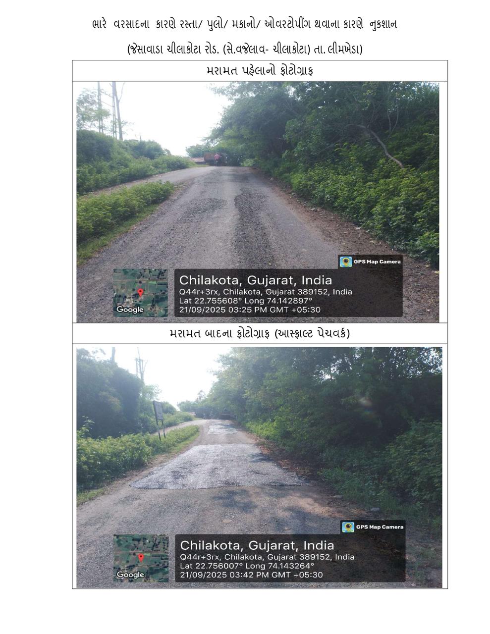 દાહોદ જિલ્લામાં વરસાદના અને ઓવરટોપીંગના થવાના કારણે ક્ષતિગ્રસ્ત થયેલ રોડ-રસ્તાઓ પર રીપેરીંગની કામગીરી ચાલુ કરવામાં આવી છે. જેમાં લીમખેડા તાલુકામાં જેસાવાડા ચીલાકોટા રોડ પર પેચવર્ક, ગરબાડા તાલુકાના આમલી નઢેલાવ ,નવાનગર રોડ પર ડામર, પેચવર્કની કામગીરી, દે. બારીયા તાલુકાના ડાંગરીયા ટોલથી ડાંગરીયા રૂવાબારી રોડ પર માર્ગ અને મકાન વિભાગ પંચાયત દ્વારા ડામર અને પેચવર્કની કામગીરી કરવામાં આવી છે.