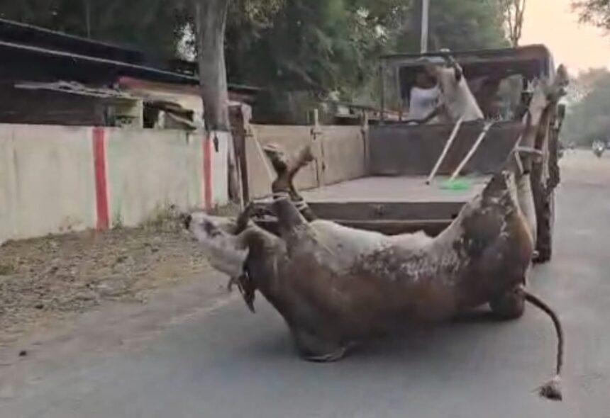 દાહોદમાં આખલાઓના યુદ્ધમાં એકનું મોત:રેલવે વિભાગે મૃત આખલાને ટ્રેક્ટરથી ઘસડ્યો,વિડીયો સોશિયલ મીડિયામાં વાયરલ.
