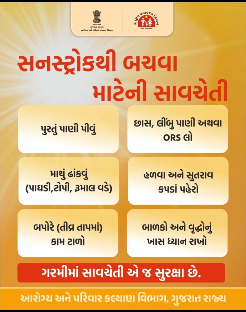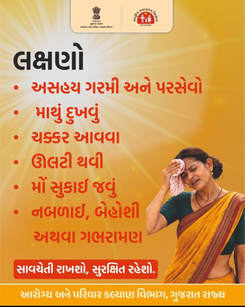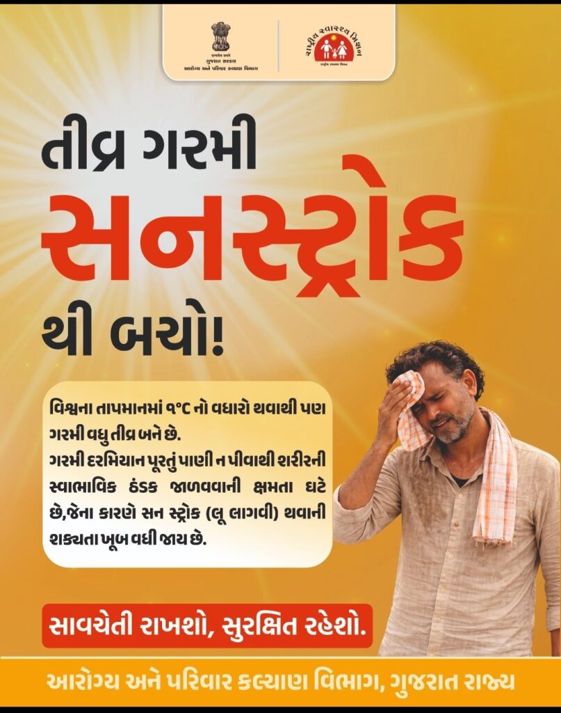 જિલ્લામાં છેલ્લા બે ત્રણ દિવસથી ગરમીનું પ્રમાણ વધી ગયું છે. અને આગામી દિવસોમાં પણ ગરમીનો પારો વધવાની શક્યતાઓ રહેલી છે.આવા સંજોગોમાં લુ લાગવાની શક્યતા વધુ રહે છે.વધુ પડતી ગરમીના કારણે લુ લાગવાના કેસો ખાસ કરીને નાના બાળકો,સગર્ભા માતાઓ,વૃધ્ધો,અશક્ત બીમાર હોય તેવા દર્દીઓ,શ્રમિકો અને ખેતમજૂરોને લૂ લાગવાની ઘટના વધુ પ્રમાણમાં બને છે.જે જીવલેણ પણ બની શકે છે.શરીર અને માથાનો દુખાવો થવો,શરીરનું તાપમાન વધી જવું,ખૂબ તરસ લાગવી,ત્વચા ગરમ,લાલાશવાળી અને શુષ્ક થઈ જવી,ઉલટી કે ઉબકા થવા કે આવવા આંખે અંધારા કે ચક્કર આવવા,શ્ર્વાચ્છોશ્ર્વાસ અને હ્રદયના ધબકારા વધી જવા,અતિ ગંભીર હોય તેવા કિસ્સામાં ખેંચ આવવી,બેભાન થઈ જવું જેવા લક્ષણો લુ લાગવા સમયે થાય છે.તે દરેક નાગરીકે જાણવું જરૂરી છે.