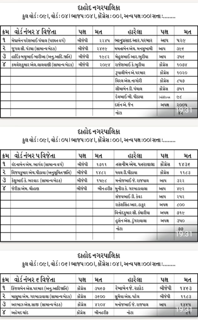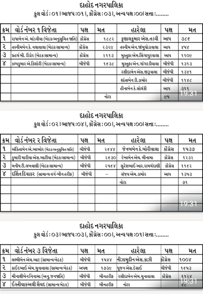 અને આમ, ભાજપે નગરપાલિકામાં પાતળી બહુમતી મેળવી હતી. તો કોંગ્રેસે આજરોજ ૧૩ બેઠકો પ્રાપ્ત કરતાં ૧૩ મળી ૦૧ બીન હરીફ મળી કુલ ૧૪ બેઠકો કોંગ્રેસના કબજામાં ગઈ હતી જ્યારે ૦૨ અપક્ષોએ પણ વીજયી મેળવ્યો હતો. આમ, દાહોદ નગરપાલિકામાં પુન: ભાજપનો બગવો લહેરાશે એ નિશ્ચિત છે.