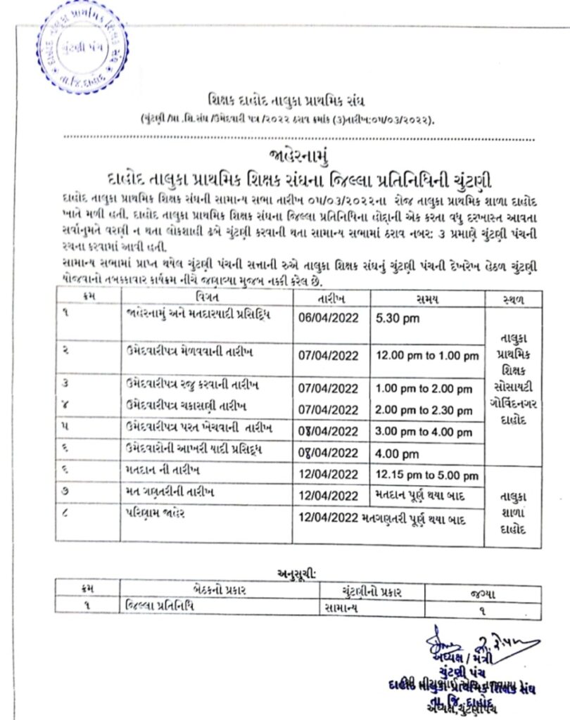 દાહોદ તાલુકા પ્રાથમિક સંઘની ગત તારીખ 05/04/2021 ના રોજ સામાન્ય સભા મળી હતી. જેમાં જિલ્લા પ્રતિનિધિની એક બેઠક માટે વરણી કરવાનું નક્કી કરવાનું હતું. પરંતુ જિલ્લા પ્રતિનિધિની એક બેઠક માટે એક કરતાં વધુ દાવેદારો ઉભા થતાં જિલ્લા પ્રતિનિધિની સર્વાનુમતે ના કરી શકી હતી.જેના પરિણામ સ્વરૂપ લોકશાહીની ઢબે ચૂંટણી યોજવાની પરિસ્થિતિ આવી બનતા ચૂંટણી પંચની રચના કરવામાં આવી હતી. જેમાં ચૂંટણી પંચની નિઘરાણી હેઠળ ચૂંટણીની તારીખો માટે જાહેરનામું પ્રસિદ્ધ કરવામાં આવ્યું છે. જેમાં ચૂંટણી લડવા ઉભા થયેલા ઉમેદવારોએ તા.07/042022 ના રોજ ૧૨થી ૧ ના ગાળામાં તાલુકા પ્રાથમિક શિક્ષણ સોસાયટી ગોવિંદ નગર ખાતે ઉમેદવારીપત્ર મેળવવાના રહેશે. ત્યારબાદ ઉમેદવારીપત્ર રજુ કરવાની તેમજ ઉમેદવારીપત્ર ચકાસણી તા.07.04.2022 ના રોજ રાખવામાં આવેલી છે. ત્યાર બાદ આગામી તા.08.04.2022 ઉમેદવારીપત્ર પાછો ખેંચવા તેમજ ઉમેદવારોની આખરી યાદી તૈયાર કરવામાં આવશે.જયારે આગામી ૧૨મી એપ્રિલના રોજ તાલુકા શાળા દાહોદ ખાતે સવારના 12:30 થી સાંજના 5 વાગ્યા સુધી મતદાન કરી શકાશે. તેમજ તે દિવસ મતદાન બાદ મત ગણતરી તેમજ પરિણામ જાહેર કરવામાં આવશે.