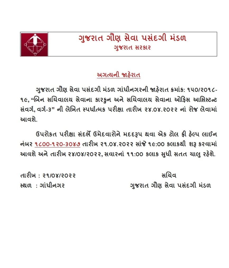 ગુજરાત ગૌણ સેવા પસંદગી મંડળ ગાંધીનગર દ્વારા આયોજિત બિન સચિવાલય ક્લાર્ક અને સચિવાલય ઓફિસ આસિસ્ટન્ટ વર્ગ-૩ સવર્ગની લેખિત પરીક્ષા આગામી તારીખ ૨૪ એપ્રિલ, રવિવારના રોજ બપોરના ૧૧ થી ૧ વાગ્યા દરમિયાન યોજાશે.