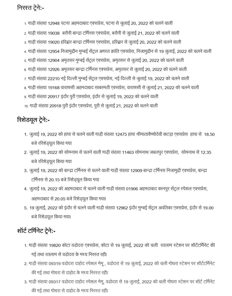 પશ્ચિમ રેલવે દ્વારા આજે 10 પેસેન્જર ટ્રેનો રદ કરાઈ: પાંચ પેસેન્જર ટ્રેનોને રિશિડ્યુલ કરાઈ: ત્રણ ટ્રેનોને શોર્ટ ટર્મિનેટ કરાઇ