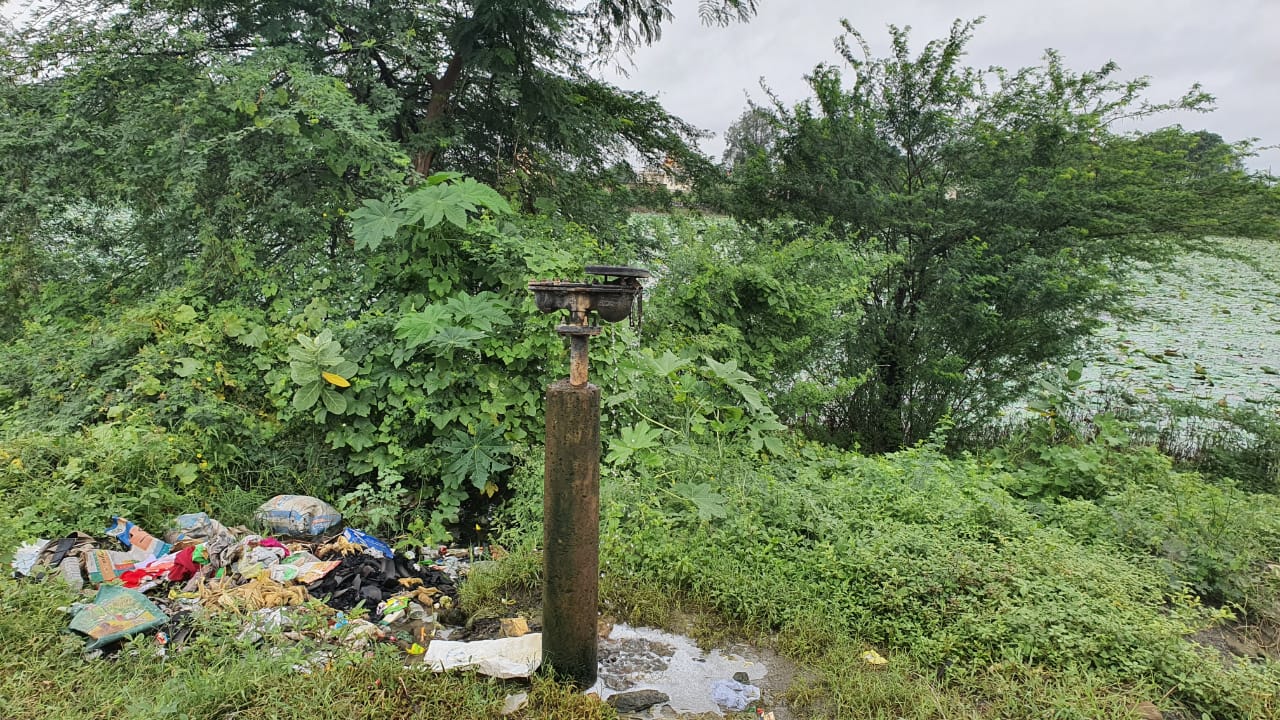 પ્રસ્તુત તસવીરમાં રામદેવ પીર જી મંદિર પાસે ભૂગર્ભ ગટરના એર વાલ માંથી દૂષિત પાણી તળાવમાં જઈ રહ્યું છે જે દ્રશ્યમાન થાય છે