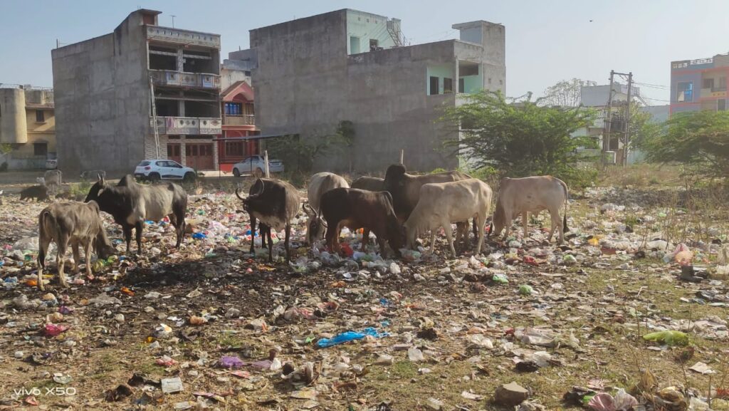 સંતરામપુરમાં સોસાયટીના ખુલ્લા પ્લોટમાં પ્લાસ્ટિક સહિતનો કચરો ઠલવાતા રખડતા પશુઓ માટે જોખમ.