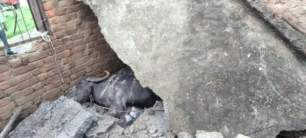 પાકા મકાન ઉપર વીજળી પડતા મકાનનો સ્લેબ તૂટી બળદ તથા ભેંસ ઉપર પડતા બે પશુઓના મોત નીપજયા